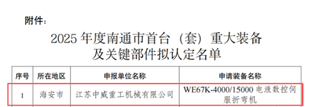 近日,南通市工业和信息化局对2025年度南通市首台(套)重大装备及关键部件拟认定名单进行公示,我司WE67K-4000/15000电液数控伺服折弯机成功入选。